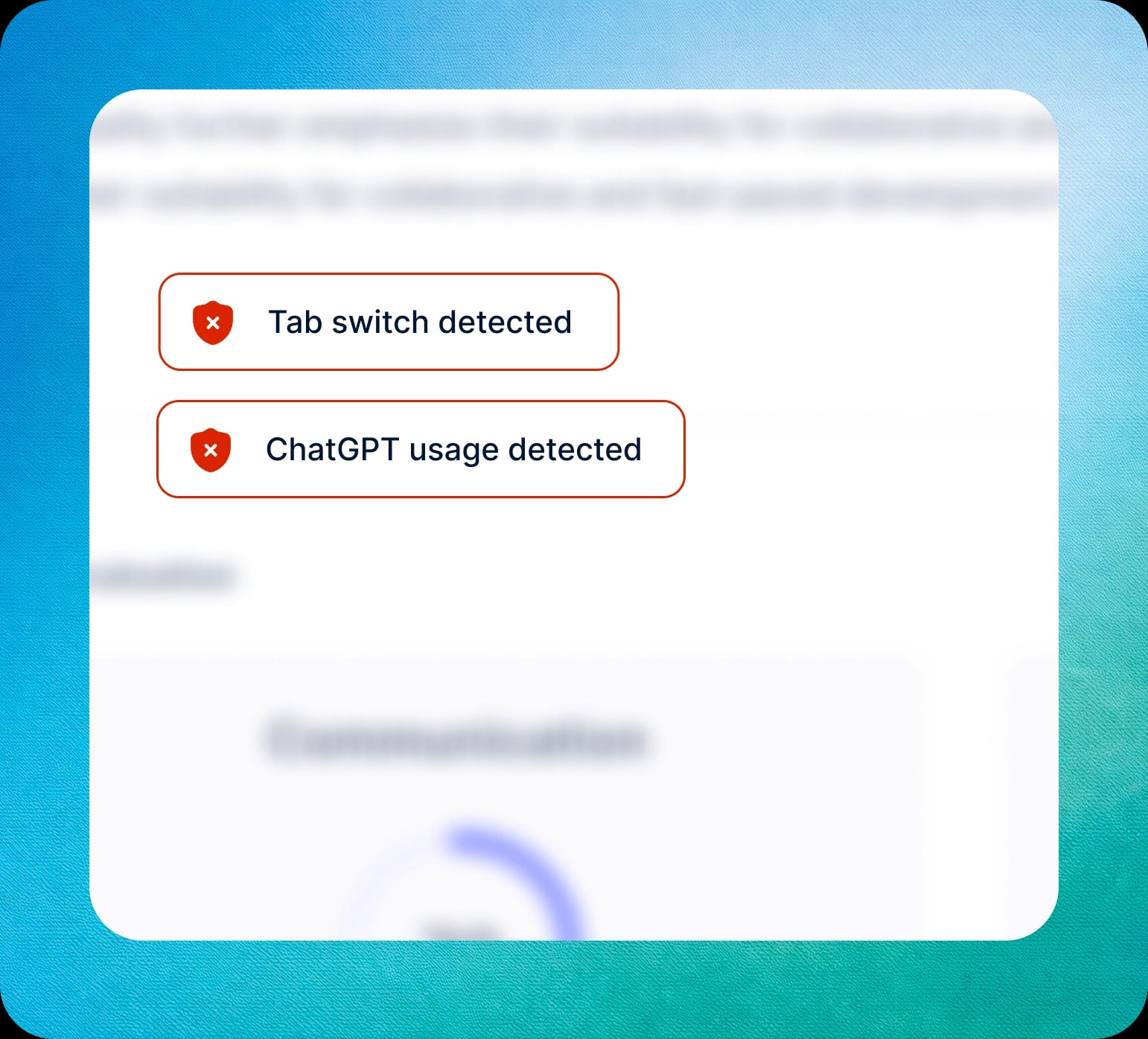 TalentRank detects any cheating attempts, including keyboard shortcuts, tab or window switches, copy-pasting, AI-generated responses, and the presence of multiple voices.